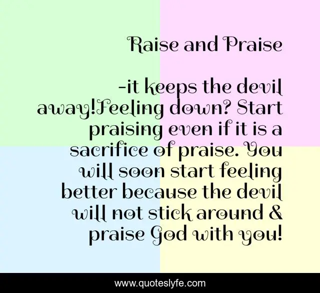 "it keeps the devil away!Feeling down? Start praising even if it is a sacrifice of praise. You will soon start feeling better because the devil will not stick around & praise God with you! Quotes." Quoteslyfe.com, 2025. Sat. 06 Dec. 2025. <https://www.quoteslyfe.com/quote/Raise-and-Praise-134563>.