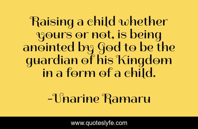 This page presents the quote "Raising a child whether yours or not, is being anointed by God to be the guardian of his Kingdom in a form of a child.". Author of this quote is Unarine Ramaru. This quote is about anointed, kingdom-of-god, child, raising-children, guardianship,.
