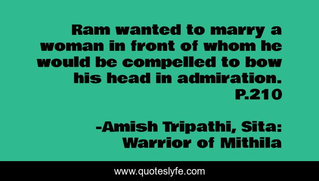This page presents the quote "Ram wanted to marry a woman in front of whom he would be compelled to bow his head in admiration. P.210". Author of this quote is Amish Tripathi, Sita: Warrior of Mithila. This quote is about enthusiasm, philosophy-of-life, feminism, inspirational,.