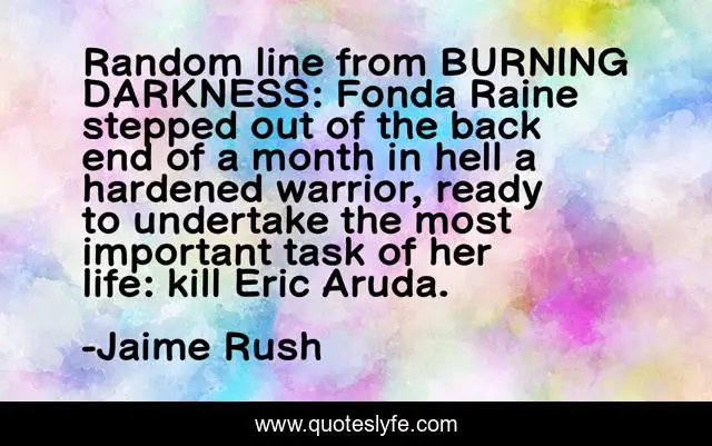 This page presents the quote "Random line from BURNING DARKNESS: Fonda Raine stepped out of the back end of a month in hell a hardened warrior, ready to undertake the most important task of her life: kill Eric Aruda.". Author of this quote is Jaime Rush. This quote is about romance, suspense, pnr, urban-fantasy,.