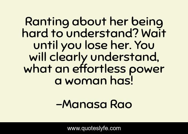 This page presents the quote "Ranting about her being hard to understand? Wait until you lose her. You will clearly understand, what an effortless power a woman has!". Author of this quote is Manasa Rao. This quote is about relationships, woman, feminism, life-lessons,.