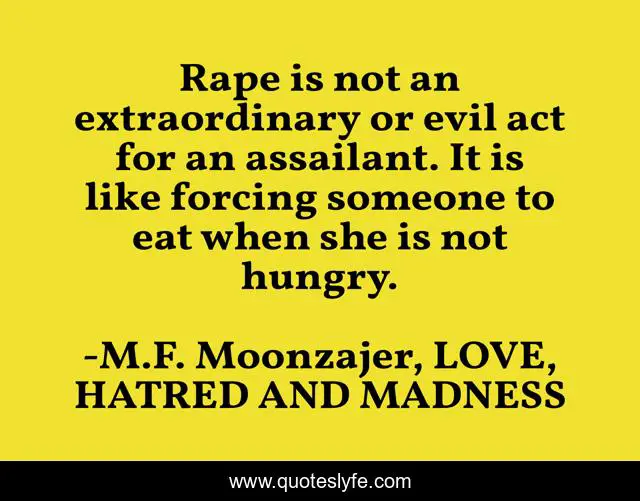 This page presents the quote "Rape is not an extraordinary or evil act for an assailant. It is like forcing someone to eat when she is not hungry.". Author of this quote is M.F. Moonzajer, LOVE, HATRED AND MADNESS. This quote is about force, hungry, evil, extraordinary, assailant, rape,.
