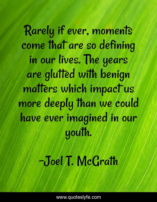 This page presents the quote "Rarely if ever, moments come that are so defining in our lives. The years are glutted with benign matters which impact us more deeply than we could have ever imagined in our youth.". Author of this quote is Joel T. McGrath. This quote is about contemplation, reflection,.
