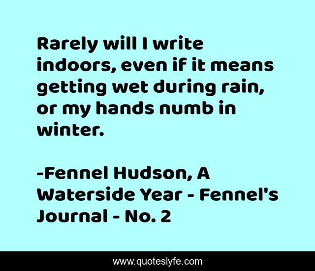 This page presents the quote "Rarely will I write indoors, even if it means getting wet during rain, or my hands numb in winter.". Author of this quote is Fennel Hudson, A Waterside Year - Fennel's Journal - No. 2. This quote is about writer, nature-writer, writers-on-writing, outdoors, writing,.