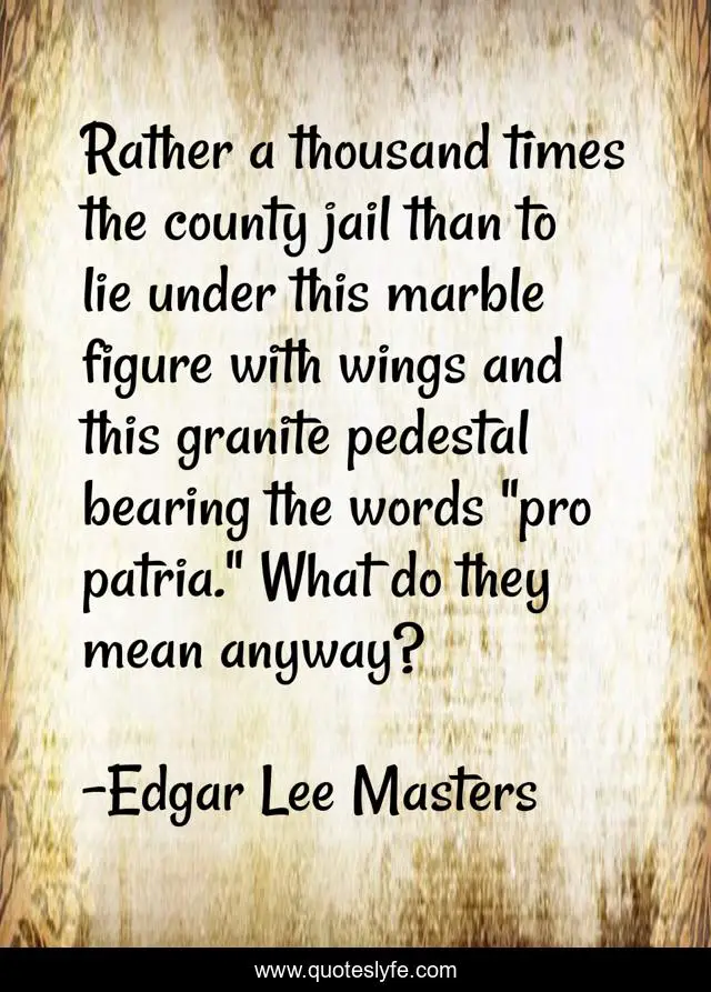 This page presents the quote "Rather a thousand times the county jail than to lie under this marble figure with wings and this granite pedestal bearing the words "pro patria." What do they mean anyway?". Author of this quote is Edgar Lee Masters. This quote is about humor, poetry,.