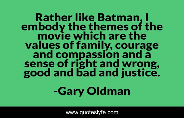 This page presents the quote "Rather like Batman, I embody the themes of the movie which are the values of family, courage and compassion and a sense of right and wrong, good and bad and justice.". Author of this quote is Gary Oldman. This quote is about compassion, good, family,.