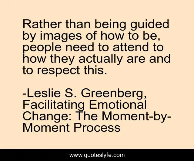 This page presents the quote "Rather than being guided by images of how to be, people need to attend to how they actually are and to respect this.". Author of this quote is Leslie S. Greenberg, Facilitating Emotional Change: The Moment-by-Moment Process. This quote is about self, psychology,.