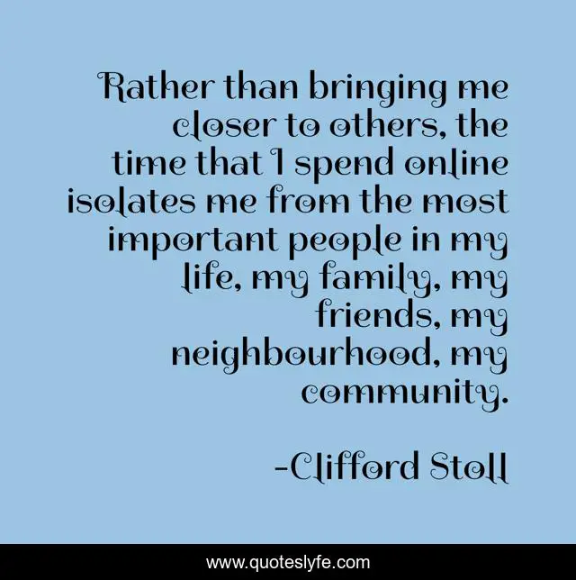 This page presents the quote "Rather than bringing me closer to others, the time that I spend online isolates me from the most important people in my life, my family, my friends, my neighbourhood, my community.". Author of this quote is Clifford Stoll. This quote is about life, friends, time,.