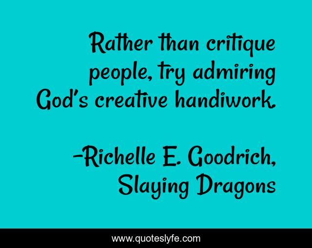 This page presents the quote "Rather than critique people, try admiring God’s creative handiwork.". Author of this quote is Richelle E. Goodrich, Slaying Dragons. This quote is about criticism, admiration, richelle-e-goodrich, positivity, critiquing-others, richelle, critique, richelle-goodrich, judging-others,.
