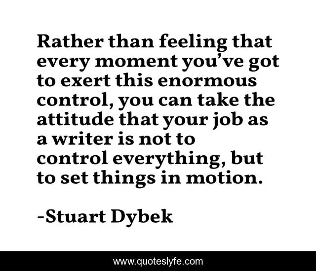 This page presents the quote "Rather than feeling that every moment you’ve got to exert this enormous control, you can take the attitude that your job as a writer is not to control everything, but to set things in motion.". Author of this quote is Stuart Dybek. This quote is about writing-process, art,.