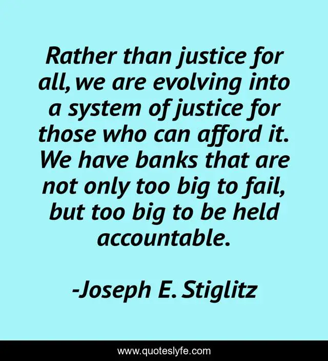 This page presents the quote "Rather than justice for all, we are evolving into a system of justice for those who can afford it. We have banks that are not only too big to fail, but too big to be held accountable.". Author of this quote is Joseph E. Stiglitz. This quote is about banks, justice, economics, inequality, injustice,.