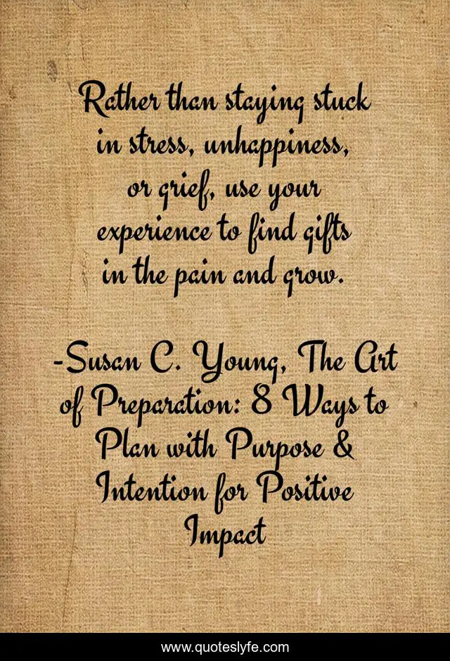 "Susan C. Young, The Art of Preparation: 8 Ways to Plan with Purpose & Intention for Positive Impact Quotes." Quoteslyfe.com, 2025. Mon. 08 Dec. 2025. <https://www.quoteslyfe.com/quote/Rather-than-staying-stuck-in-stress-unhappiness-227460>.