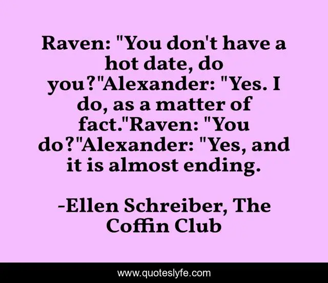 This page presents the quote "Raven: "You don't have a hot date, do you?"Alexander: "Yes. I do, as a matter of fact."Raven: "You do?"Alexander: "Yes, and it is almost ending.". Author of this quote is Ellen Schreiber, The Coffin Club. This quote is about raven-madison, vampires, raven, vampire, ellen-schreiber, vampire-kisses, the-coffin-club, alexander, alexander-sterling,.