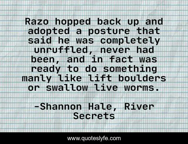 This page presents the quote "Razo hopped back up and adopted a posture that said he was completely unruffled, never had been, and in fact was ready to do something manly like lift boulders or swallow live worms.". Author of this quote is Shannon Hale, River Secrets. .