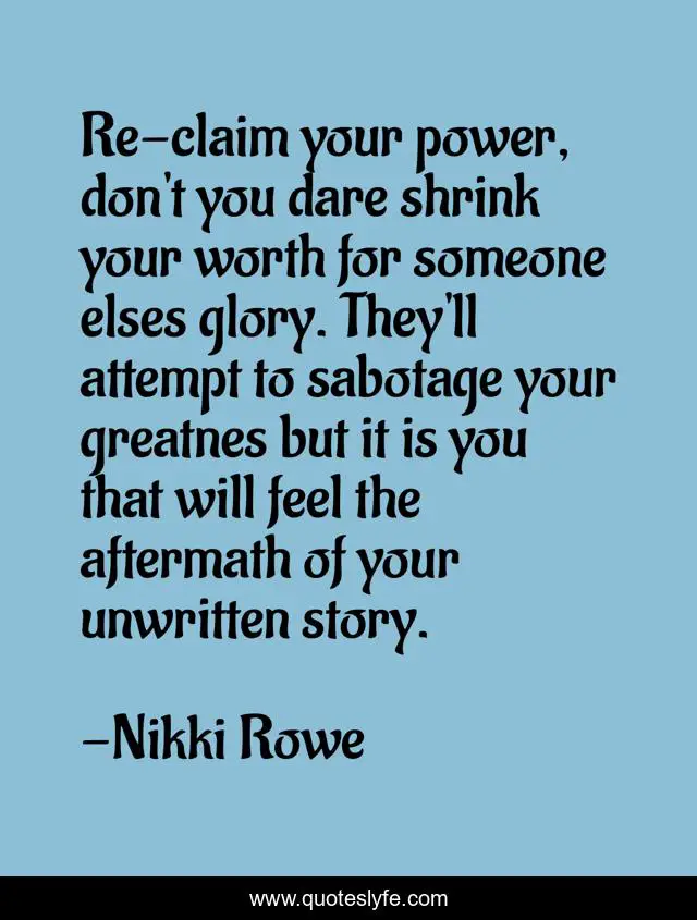 This page presents the quote "Re-claim your power, don't you dare shrink your worth for someone elses glory. They'll attempt to sabotage your greatnes but it is you that will feel the aftermath of your unwritten story.". Author of this quote is Nikki Rowe. This quote is about personal-power, personal-growth, growth, self-improvement, self-help, authentic, inner-being,.