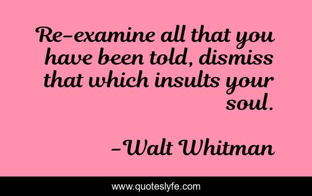 This page presents the quote "Re-examine all that you have been told, dismiss that which insults your soul.". Author of this quote is Walt Whitman. This quote is about enthusiasm, thought-provoking, inspirational, points-to-ponder,.