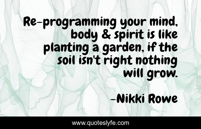 This page presents the quote "Re-programming your mind, body & spirit is like planting a garden, if the soil isn't right nothing will grow.". Author of this quote is Nikki Rowe. This quote is about beautiful, simplicity, life, insight, art, beauty, self-awareness, philosophy, soul,.