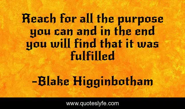 This page presents the quote "Reach for all the purpose you can and in the end you will find that it was fulfilled". Author of this quote is Blake Higginbotham. This quote is about forward, living, moving, goals, plans,.
