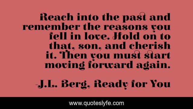 This page presents the quote "Reach into the past and remember the reasons you fell in love. Hold on to that, son, and cherish it. Then you must start moving forward again.". Author of this quote is J.L. Berg, Ready for You. This quote is about past, love, second-chances, affection,.