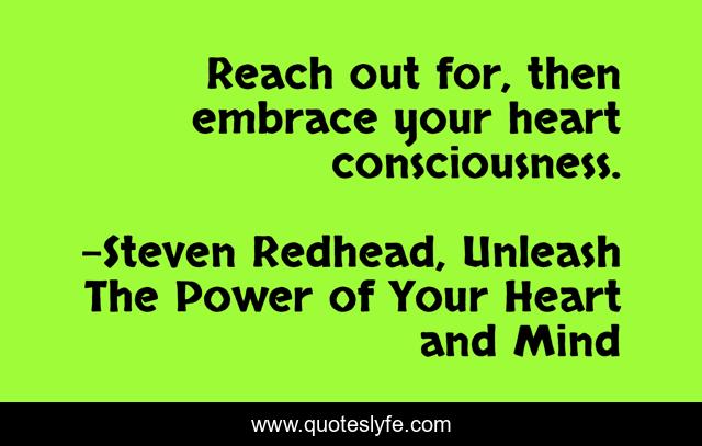 This page presents the quote "Reach out for, then embrace your heart consciousness.". Author of this quote is Steven Redhead, Unleash The Power of Your Heart and Mind. This quote is about heart, embrace, consciousness,.