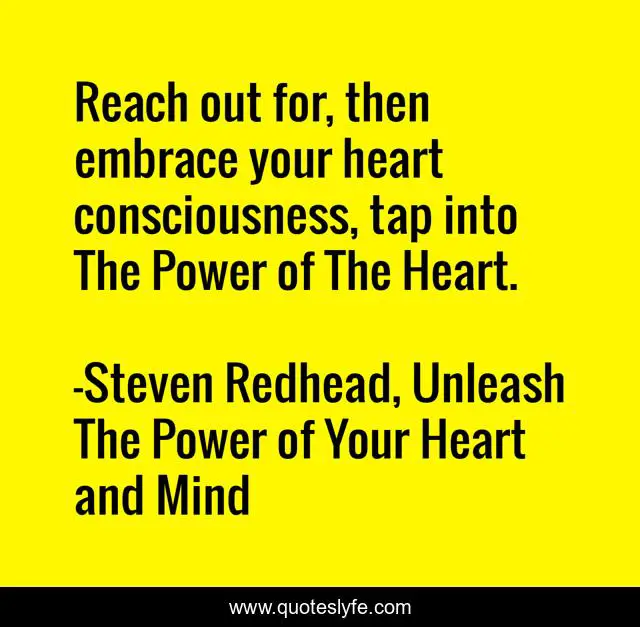 This page presents the quote "Reach out for, then embrace your heart consciousness, tap into The Power of The Heart.". Author of this quote is Steven Redhead, Unleash The Power of Your Heart and Mind. This quote is about power-of-the-heart, heart, heart-consciousness, consciousness,.