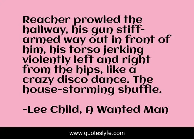 This page presents the quote "Reacher prowled the hallway, his gun stiff-armed way out in front of him, his torso jerking violently left and right from the hips, like a crazy disco dance. The house-storming shuffle.". Author of this quote is Lee Child, A Wanted Man. .
