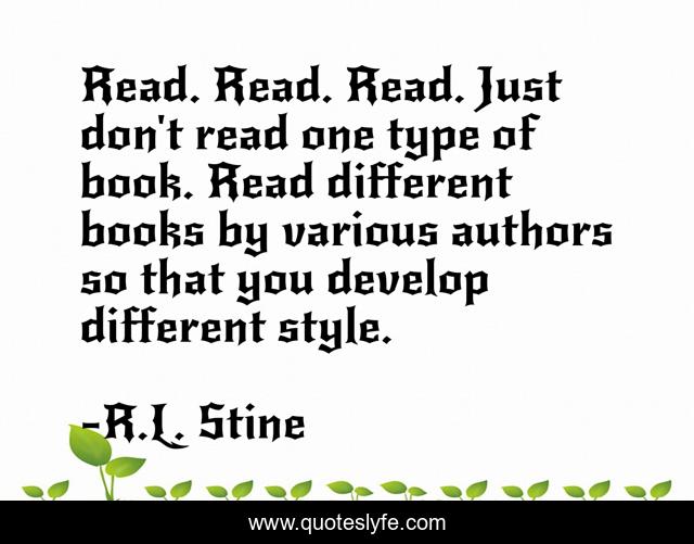This page presents the quote "Read. Read. Read. Just don't read one type of book. Read different books by various authors so that you develop different style.". Author of this quote is R.L. Stine. This quote is about horror, reading, diversity,.