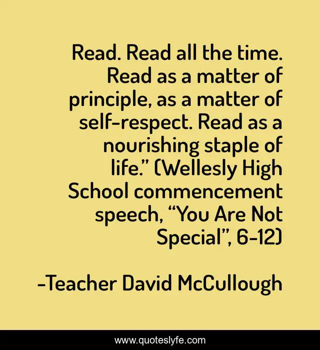 This page presents the quote "Read. Read all the time. Read as a matter of principle, as a matter of self-respect. Read as a nourishing staple of life.” (Wellesly High School commencement speech, “You Are Not Special”, 6-12)". Author of this quote is Teacher David McCullough. This quote is about you-are-not-special, read, advice, graduation, reading, commencement,.