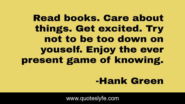 This page presents the quote "Read books. Care about things. Get excited. Try not to be too down on youself. Enjoy the ever present game of knowing.". Author of this quote is Hank Green. This quote is about enthusiasm, inspirational,.