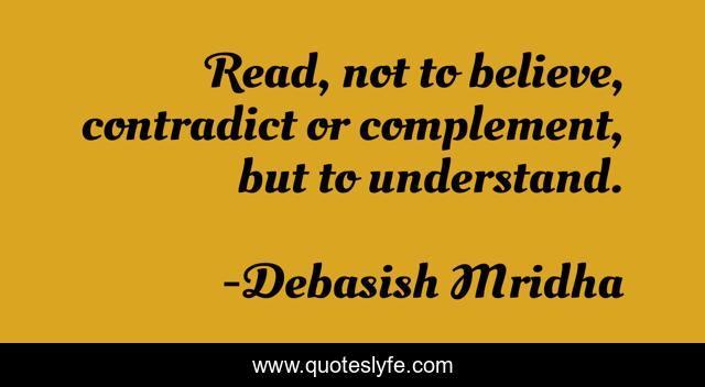 This page presents the quote "Read, not to believe, contradict or complement, but to understand.". Author of this quote is Debasish Mridha. This quote is about life, love, knowledge, inspirational, intelligence, philosophy, wisdom, quotes, affection,.