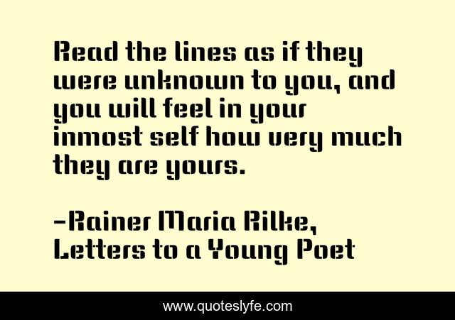 This page presents the quote "Read the lines as if they were unknown to you, and you will feel in your inmost self how very much they are yours.". Author of this quote is Rainer Maria Rilke, Letters to a Young Poet. This quote is about poet, poetry, writing,.