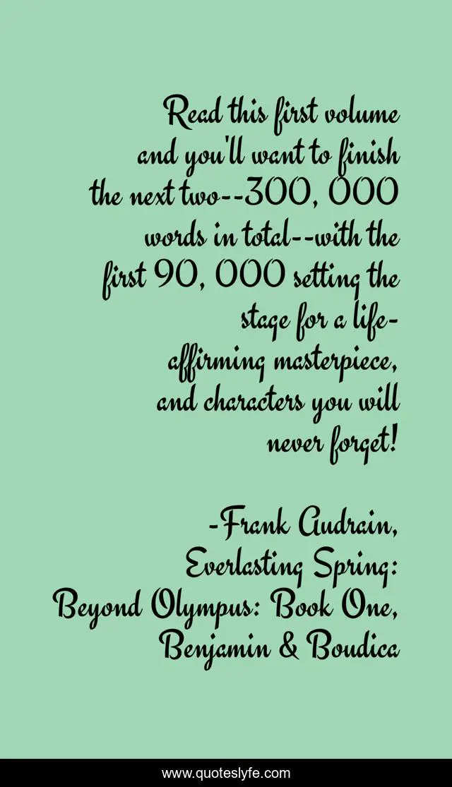 This page presents the quote "Read this first volume and you'll want to finish the next two--300, 000 words in total--with the first 90, 000 setting the stage for a life-affirming masterpiece, and characters you will never forget!". Author of this quote is Frank Audrain, Everlasting Spring: Beyond Olympus: Book One, Benjamin & Boudica. This quote is about drama, love, peace, betrayal, romance, conflict, everlasting, forgiveness, affection,.