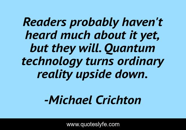This page presents the quote "Readers probably haven't heard much about it yet, but they will. Quantum technology turns ordinary reality upside down.". Author of this quote is Michael Crichton. This quote is about down, upside down, reality,.