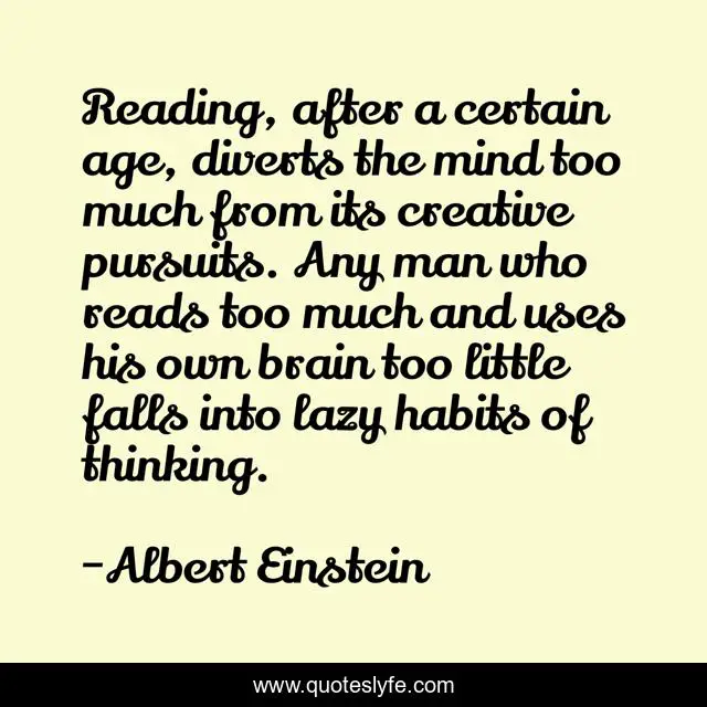 This page presents the quote "Reading, after a certain age, diverts the mind too much from its creative pursuits. Any man who reads too much and uses his own brain too little falls into lazy habits of thinking.". Author of this quote is Albert Einstein. This quote is about science, reading,.