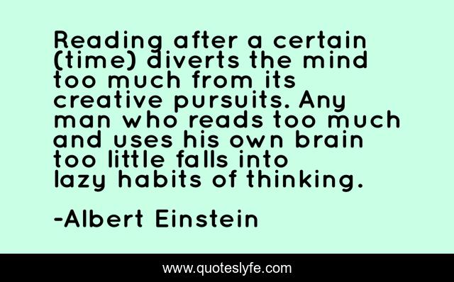 This page presents the quote "Reading after a certain (time) diverts the mind too much from its creative pursuits. Any man who reads too much and uses his own brain too little falls into lazy habits of thinking.". Author of this quote is Albert Einstein. This quote is about books, reading,.