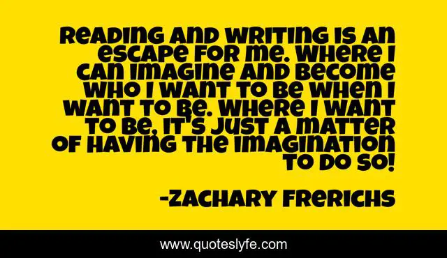 This page presents the quote "Reading and writing is an escape for me. Where I can imagine and become who I want to be when I want to be. Where I want to be, it's just a matter of having the imagination to do so!". Author of this quote is Zachary Frerichs. .