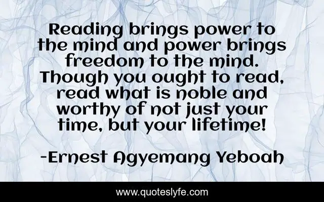 This page presents the quote "Reading brings power to the mind and power brings freedom to the mind. Though you ought to read, read what is noble and worthy of not just your time, but your lifetime!". Author of this quote is Ernest Agyemang Yeboah. This quote is about good-reader, read-what-is-good, reading, mind-your-mind, wisdom,.