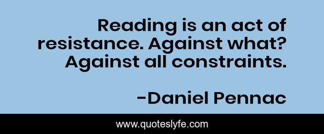 This page presents the quote "Reading is an act of resistance. Against what? Against all constraints.". Author of this quote is Daniel Pennac. This quote is about reading, reader, rights,.