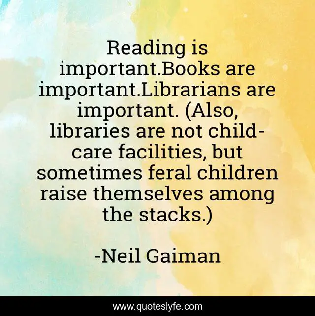 This page presents the quote "Reading is important.Books are important.Librarians are important. (Also, libraries are not child-care facilities, but sometimes feral children raise themselves among the stacks.)". Author of this quote is Neil Gaiman. This quote is about libraries, newbery-medal-acceptance-speech, books, reading,.