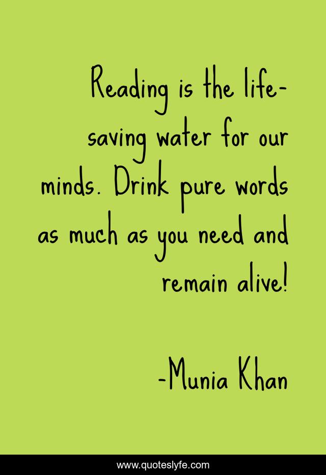 This page presents the quote "Reading is the life-saving water for our minds. Drink pure words as much as you need and remain alive!". Author of this quote is Munia Khan. This quote is about reading-books, mind, alive, livesaving, books, book, reader, enthusiasm, reading,.
