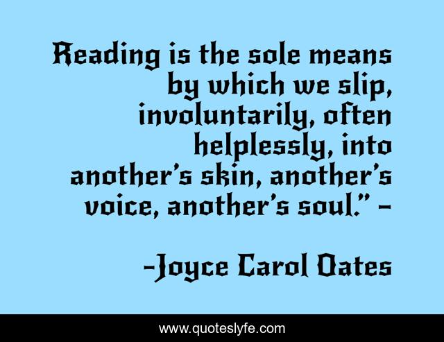 This page presents the quote "Reading is the sole means by which we slip, involuntarily, often helplessly, into another’s skin, another’s voice, another’s soul.” —". Author of this quote is Joyce Carol Oates. .