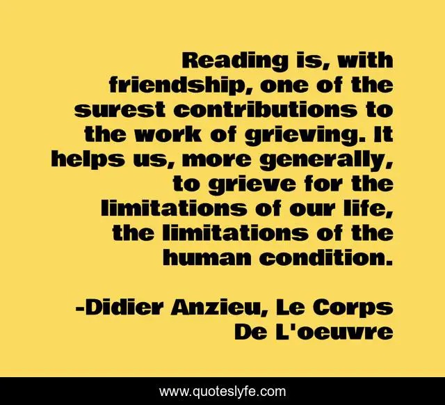 This page presents the quote "Reading is, with friendship, one of the surest contributions to the work of grieving. It helps us, more generally, to grieve for the limitations of our life, the limitations of the human condition.". Author of this quote is Didier Anzieu, Le Corps De L'oeuvre. This quote is about friendship, grieving, love, reading, affection,.