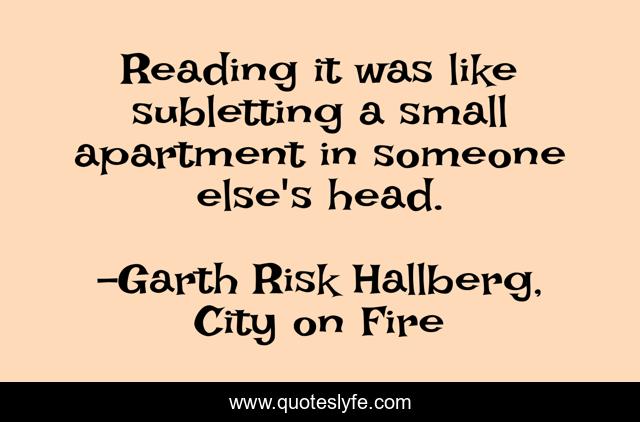 This page presents the quote "Reading it was like subletting a small apartment in someone else's head.". Author of this quote is Garth Risk Hallberg, City on Fire. This quote is about simile, city-on-fire, insight, reading, garth-risk-hallberg,.