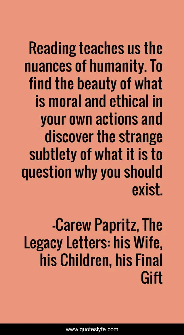This page presents the quote "Reading teaches us the nuances of humanity. To find the beauty of what is moral and ethical in your own actions and discover the strange subtlety of what it is to question why you should exist.". Author of this quote is Carew Papritz, The Legacy Letters: his Wife, his Children, his Final Gift. This quote is about read, quote, quotes, book, books, the-legacy-letters, carew-papritz, reading,.