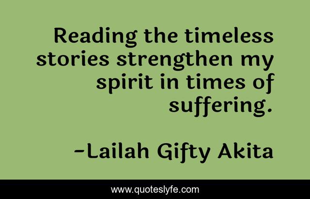 This page presents the quote "Reading the timeless stories strengthen my spirit in times of suffering.". Author of this quote is Lailah Gifty Akita. This quote is about spiritual, strength, positive, motivational, confidence, suffering, optimistic, reading,.