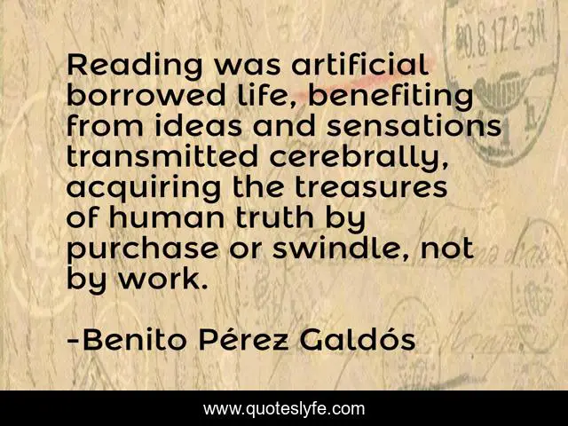 This page presents the quote "Reading was artificial borrowed life, benefiting from ideas and sensations transmitted cerebrally, acquiring the treasures of human truth by purchase or swindle, not by work.". Author of this quote is Benito Pérez Galdós. .