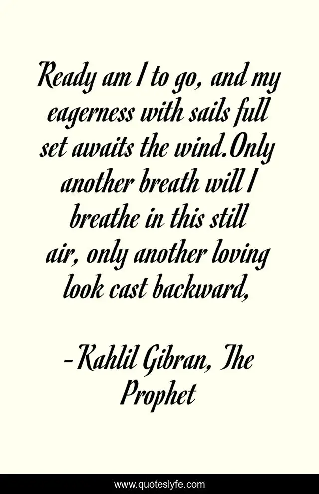 This page presents the quote "Ready am I to go, and my eagerness with sails full set awaits the wind.Only another breath will I breathe in this still air, only another loving look cast backward, ". Author of this quote is Kahlil Gibran, The Prophet. This quote is about home, life, inspiration, travel, moving-on,.