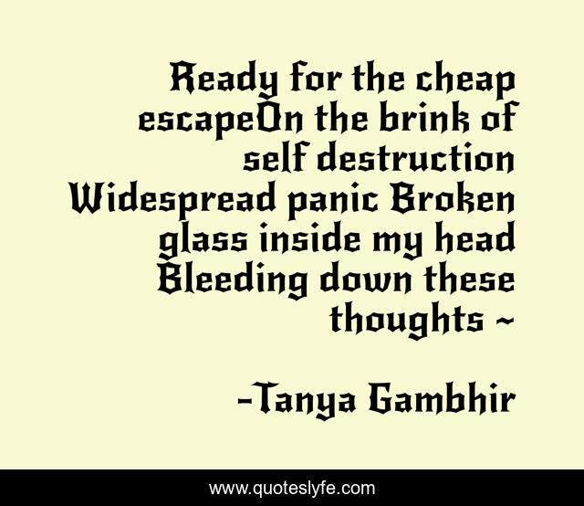 This page presents the quote "Ready for the cheap escapeOn the brink of self destruction Widespread panic Broken glass inside my head Bleeding down these thoughts ~". Author of this quote is Tanya Gambhir. This quote is about love, broken, quotes, journey, affection, destruction,.