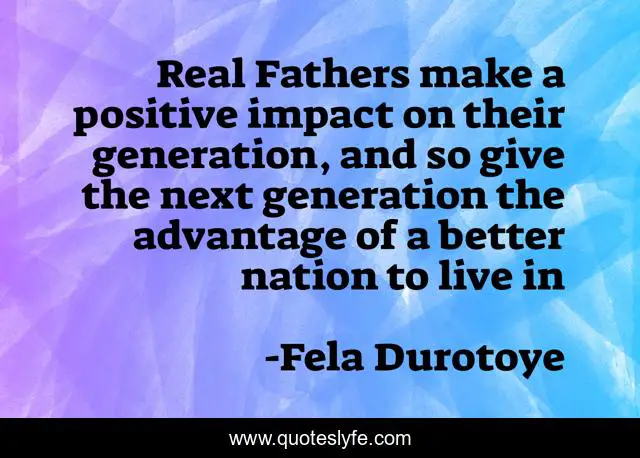 This page presents the quote "Real Fathers make a positive impact on their generation, and so give the next generation the advantage of a better nation to live in". Author of this quote is Fela Durotoye. This quote is about parenting, fatherhood,.