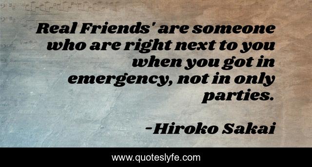 This page presents the quote "Real Friends' are someone who are right next to you when you got in emergency, not in only parties.". Author of this quote is Hiroko Sakai. This quote is about relation, friendship, love, friend, affection,.